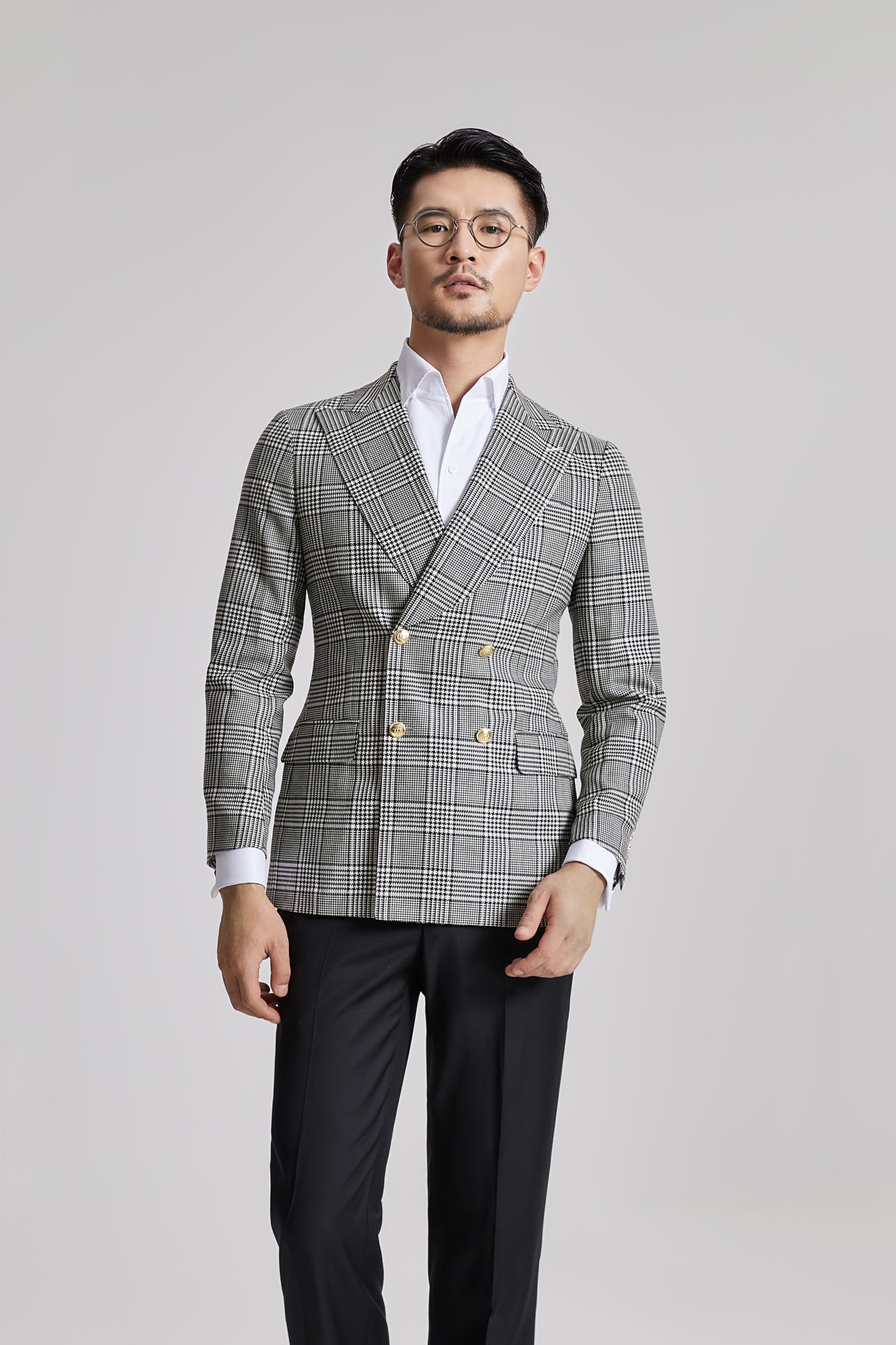 #YF0471 灰格纹双排扣两件套